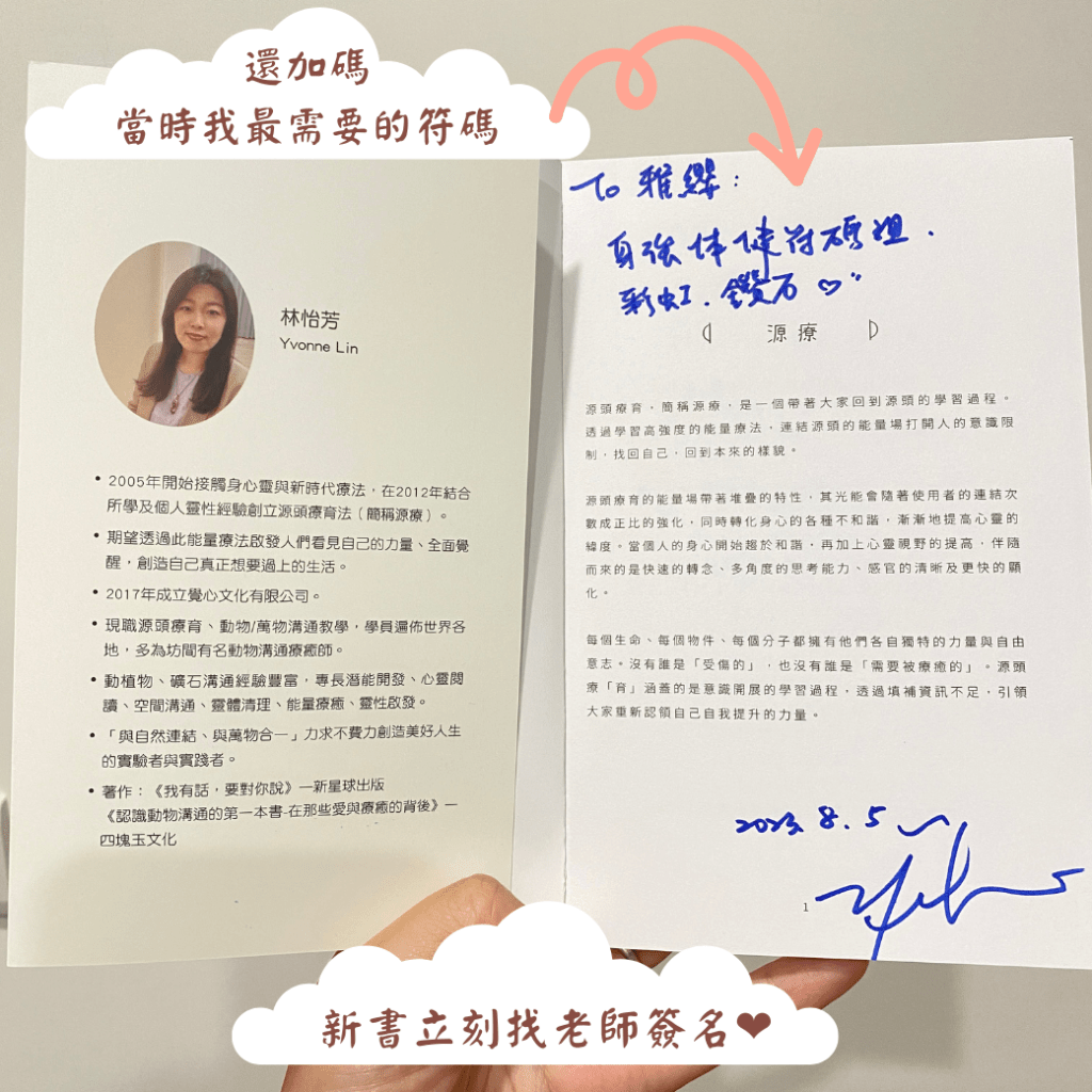 分享會結束後,我也立刻找老師請她幫我新買的小書簽名,老師還詢問「要不要幫你抽個符碼?」,這麼好的機會怎麼能夠錯過呢!肯定是要的呀~老師也很貼心地幫我把抽到的符碼寫在小書上,三個符碼也非常對應我今天所選的選項,再一次提醒我,顧好身體,才可以去接收超過我所想像的無限可能得金錢與豐盛。