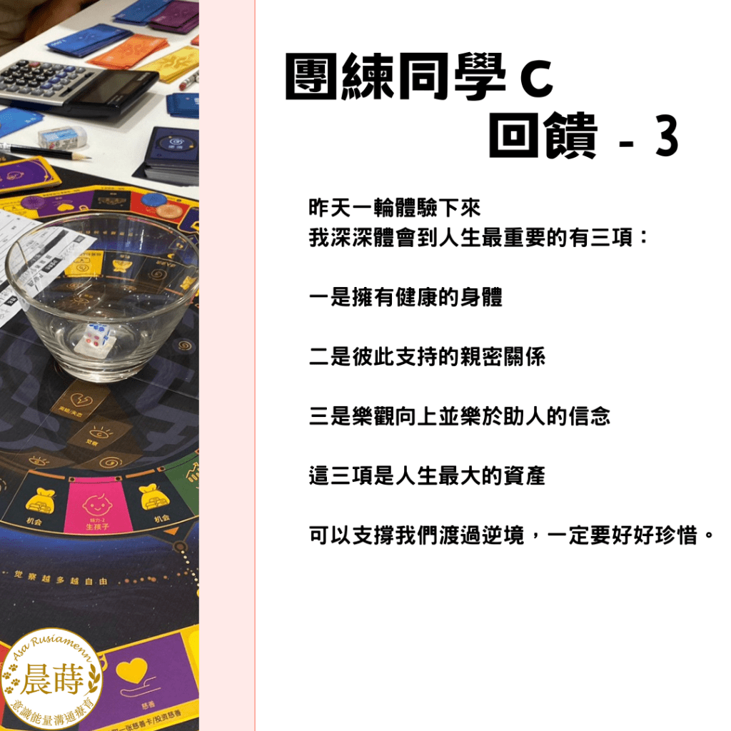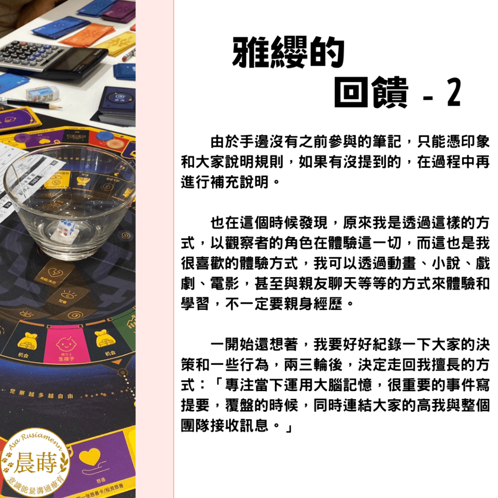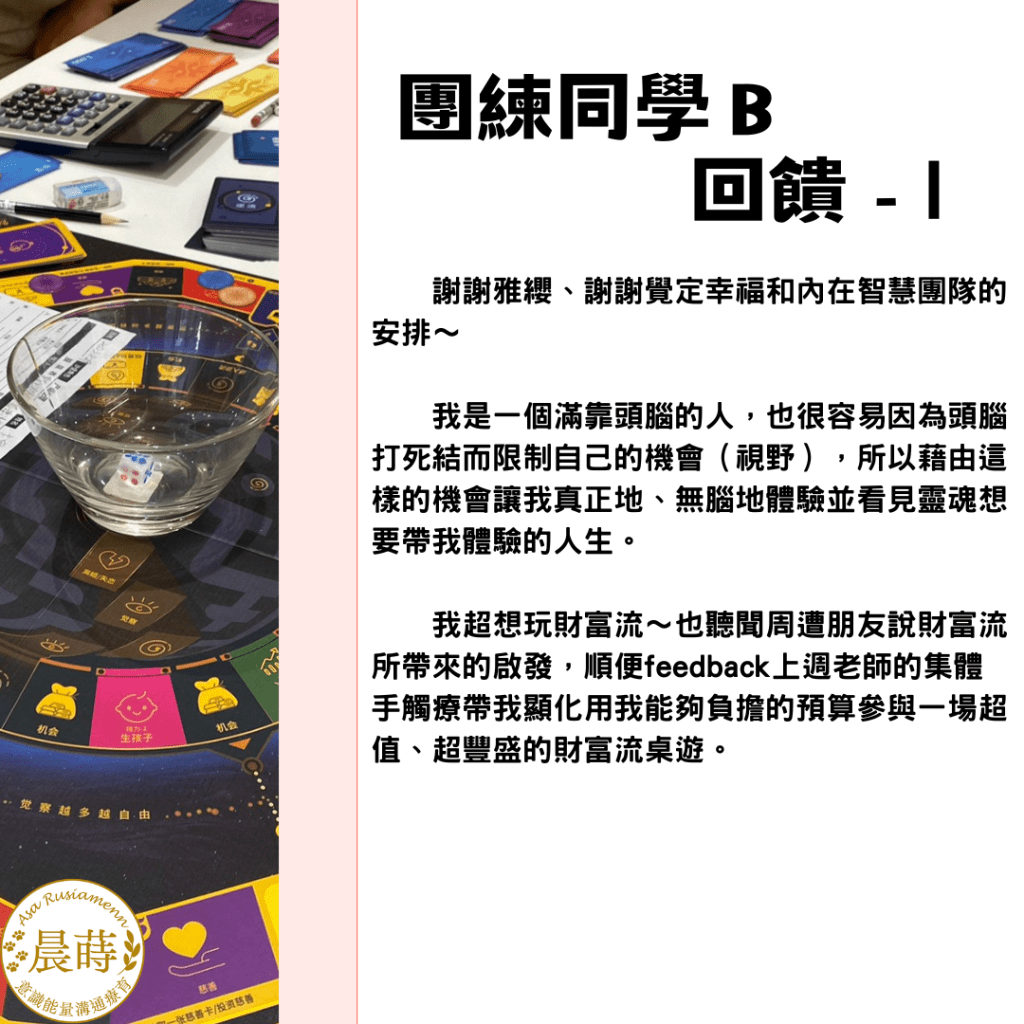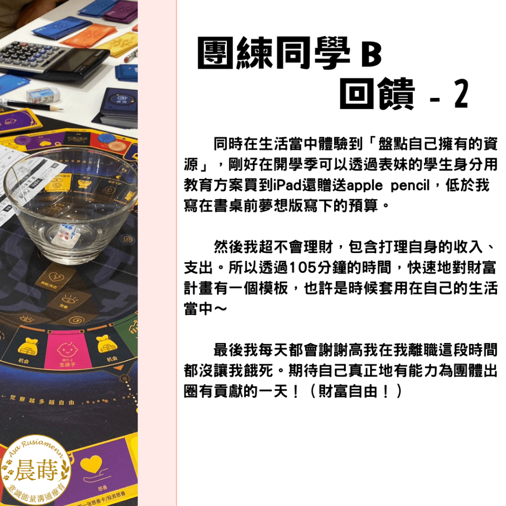 團練夥伴E:參加過一次財富流,本次體驗高收入高支出的角色。(之後補上回饋)