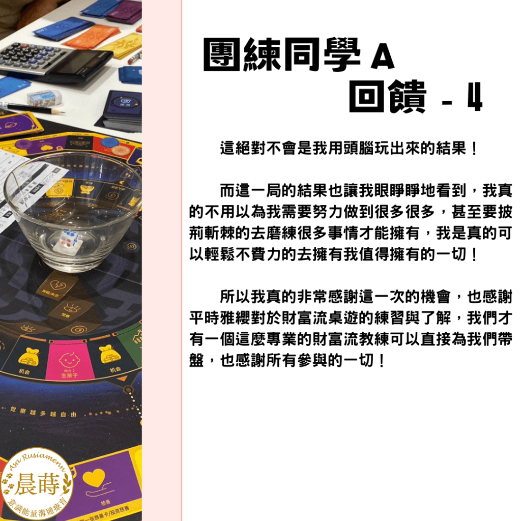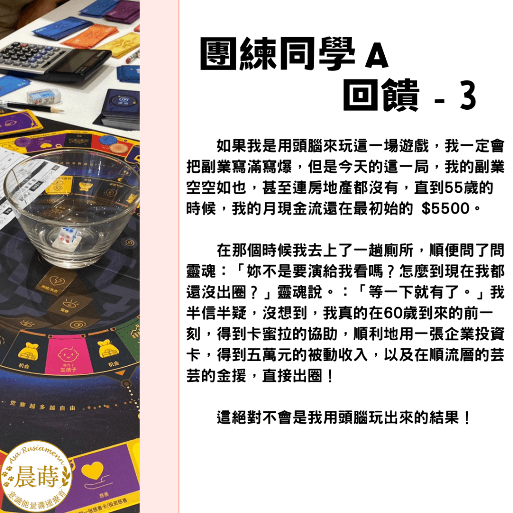 團練夥伴A:參加過兩三次財富流,本次抽到高收入、高支出的角色。