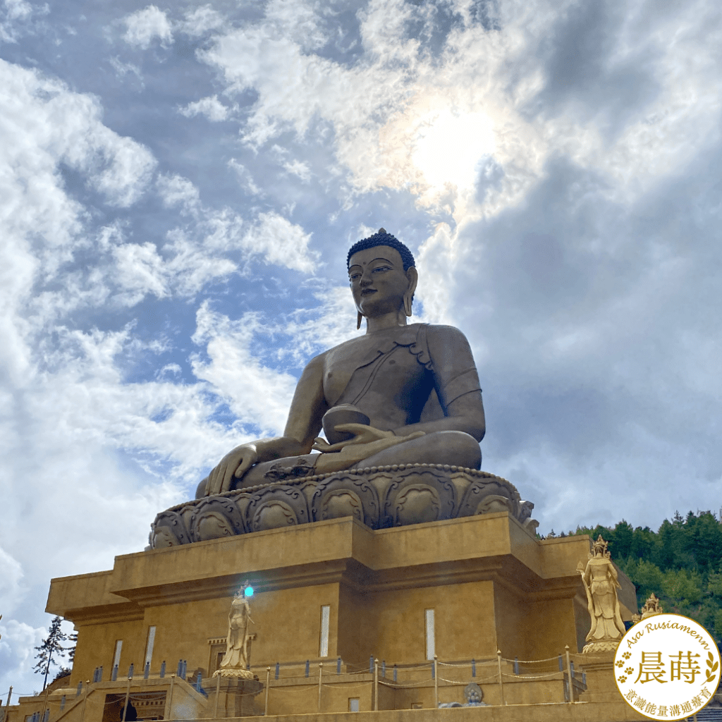 照片上的大佛是釋迦摩尼佛,高約有169 英尺(52 m),在其內部還有數以萬計的小佛像,在寺中大家輪流用額頭觸碰著佛身下的蓮臺,接收那個穩穩地、非常明亮的能量,念著各自感到需要的自由意志,現在想想這是否是開啟不丹奇幻旅程的重要關鍵呢?