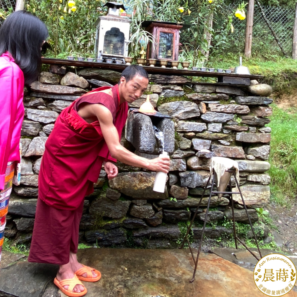在這座寺廟中還有一處聖水,有一位小喇嘛帶著我們過去,並協助我們各自裝一壺聖水,注意到我們在拍照,他還會特意保持動作看鏡頭,等待我們拍照完畢,後來我們也邀請他與我們一起拍照留念。