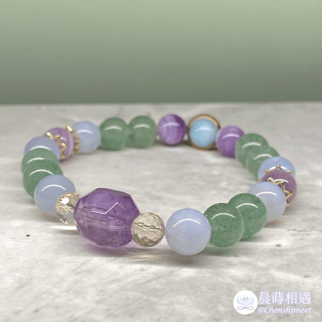 在製作的時候,我整個人保持著很放鬆的狀態,沒有特別錨定什麼目的,就是輕鬆地挑選珠子,偶爾會哼幾句不成調的旋律。完成後,我按照習慣先用昇陽香再一次淨化祂,然後就先擺著等能量順一陣子。